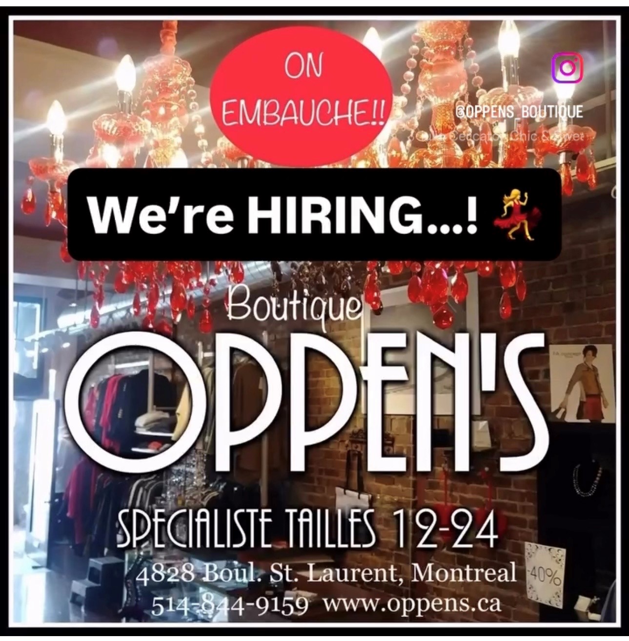 📣WE’RE HIRING…..OFFRE D’EMPLOI chez Boutique Oppen’s Plus Sizes Montréal ! Nous recherchons un(e) vendeur/vendeuse dynamique et parfaitement bilingue (FRANÇAIS ET ANGLAIS) pour rejoindre notre équipe chez Boutique Oppen’s. Vous êtes intéressé(e) ? ..Ou vous connaissez la personne idéale? Veuillez nous contacter pour plus d’informations au 514-844-9159 ou envoyer votre CV à info@oppens.ca. FAITES PASSER LE MOT ! 🙌